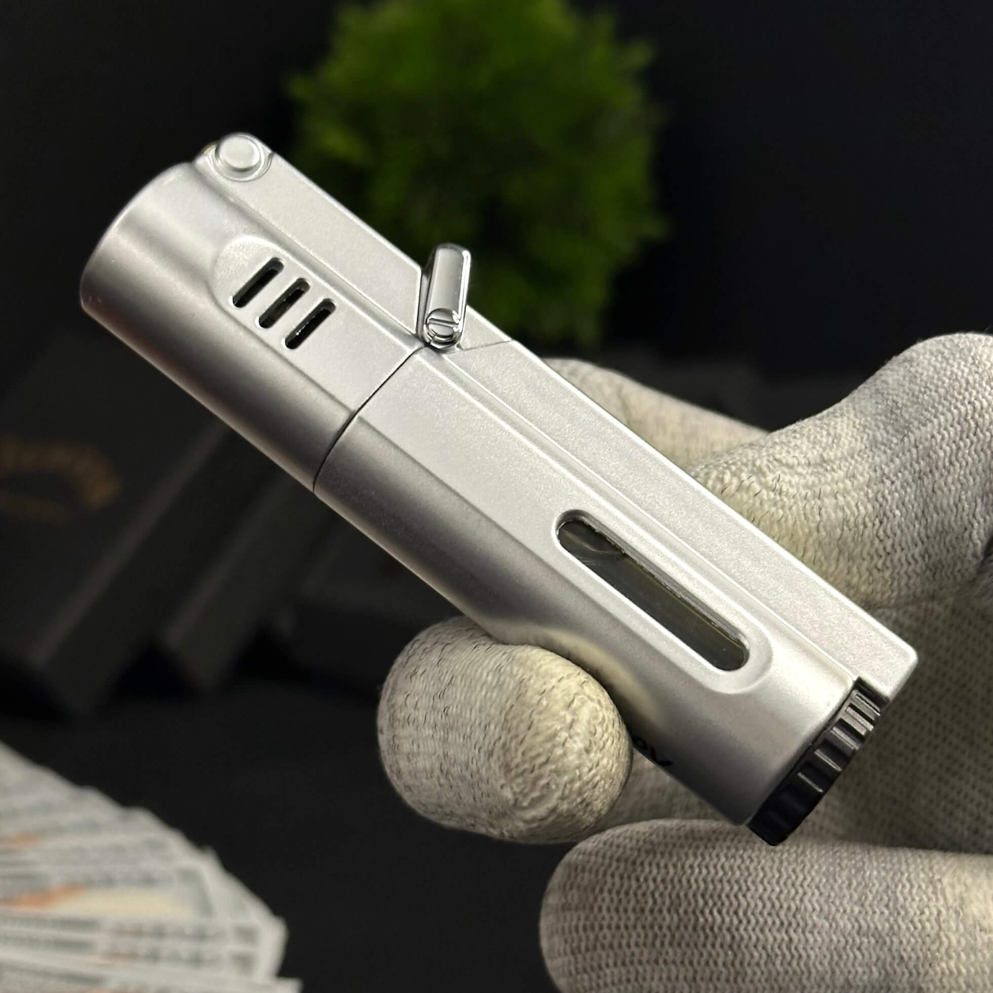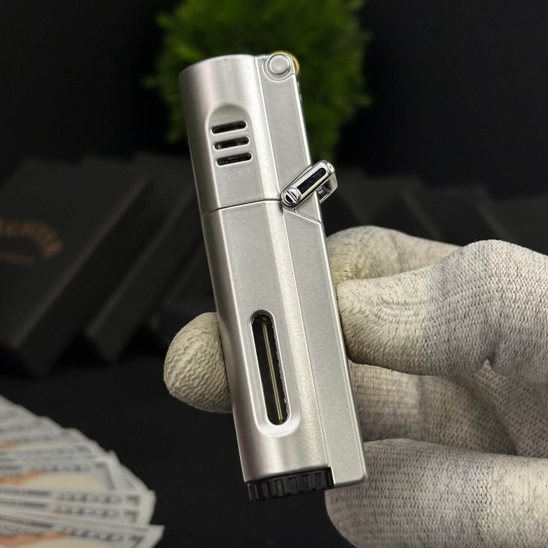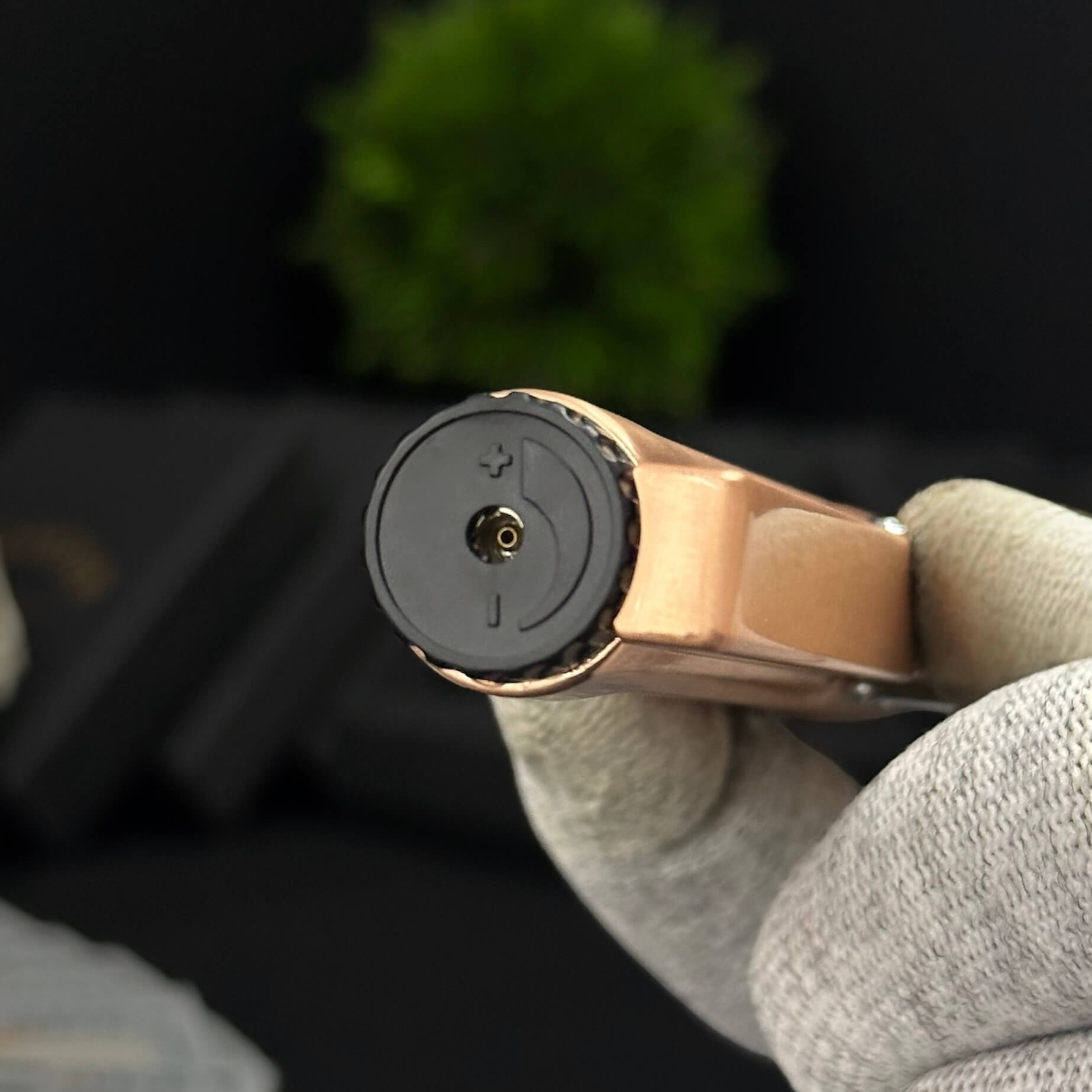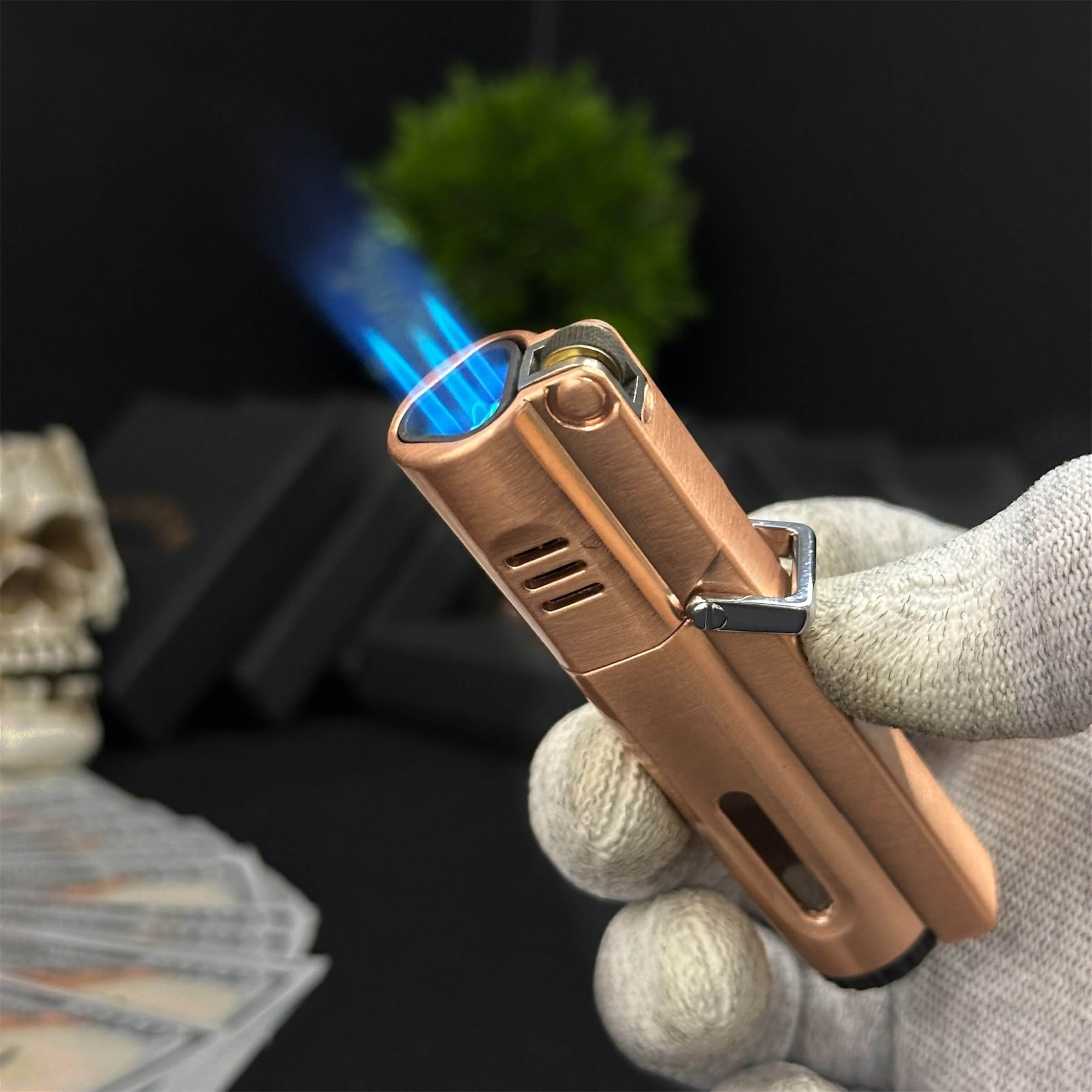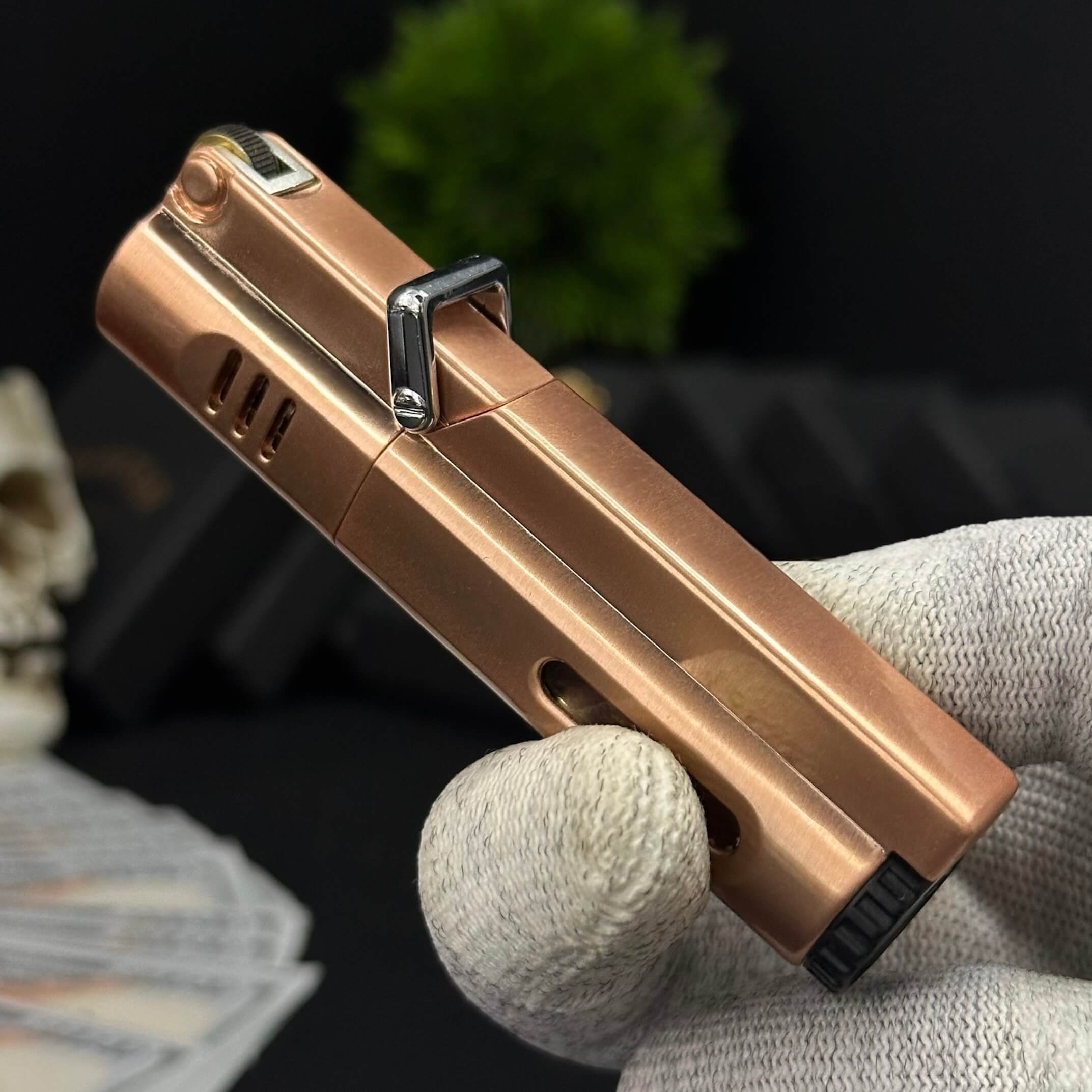 Luxury cigar lighter with a metallic copper-style finish, triple jet flames, and safety side-press ignition.