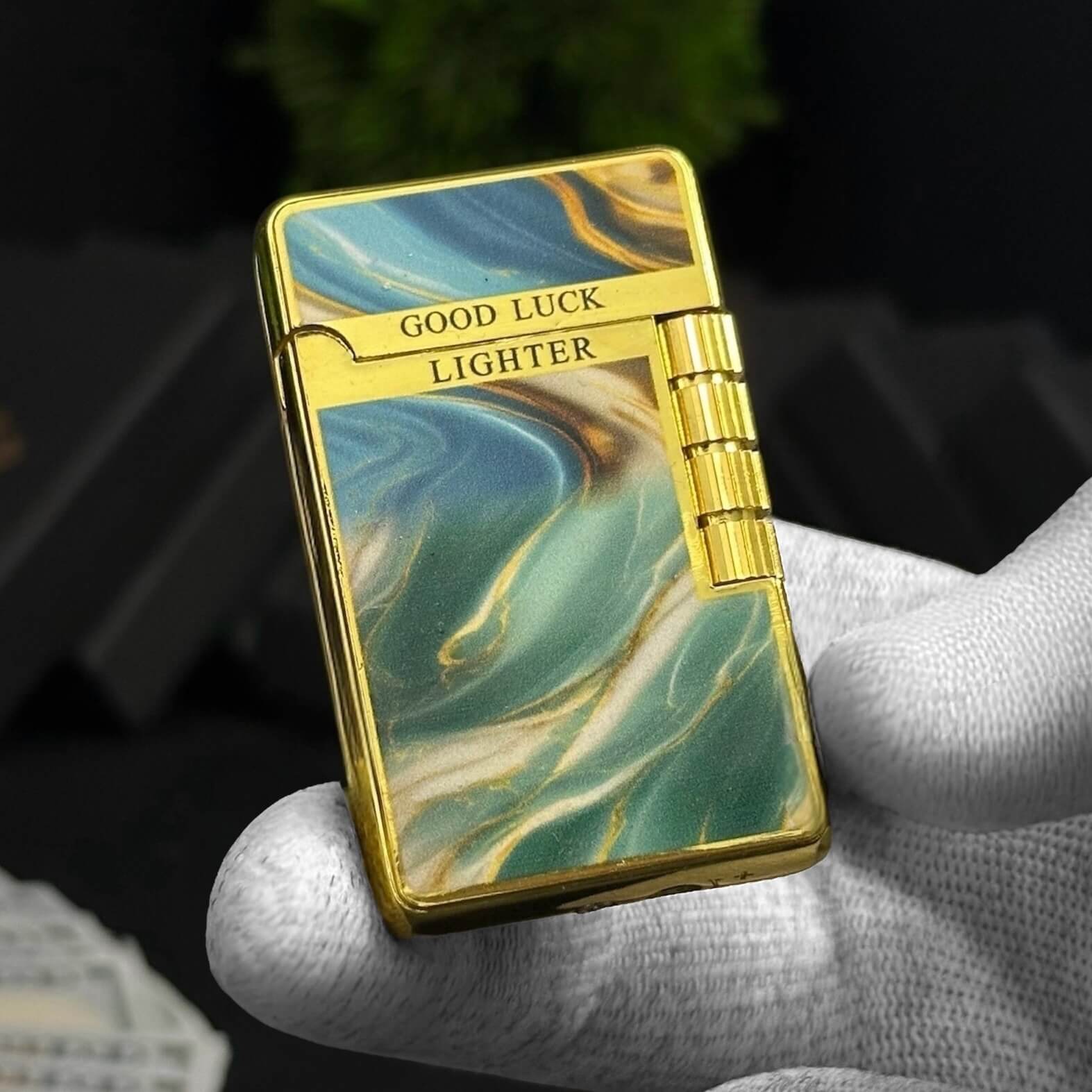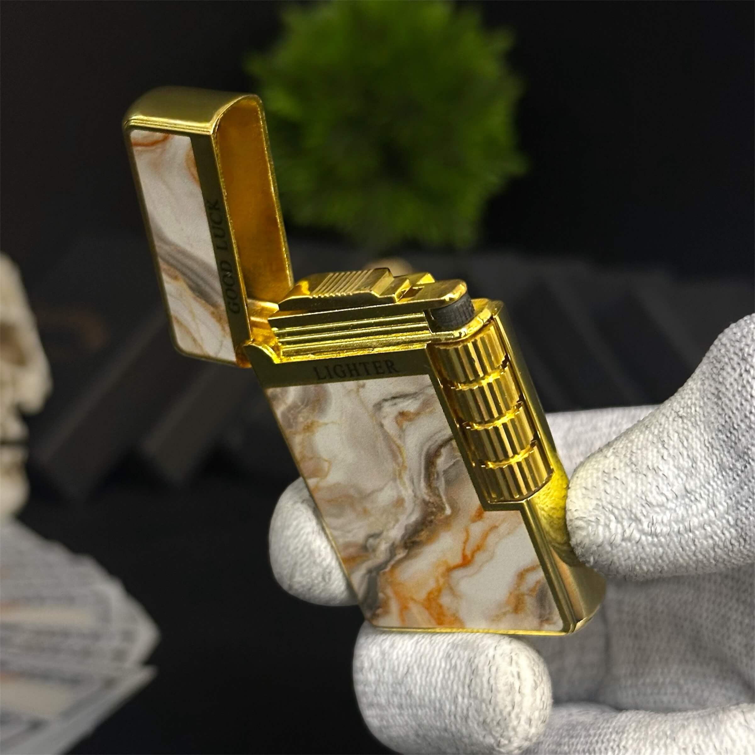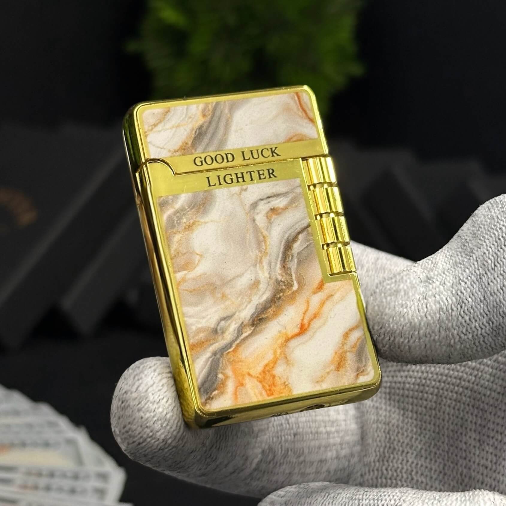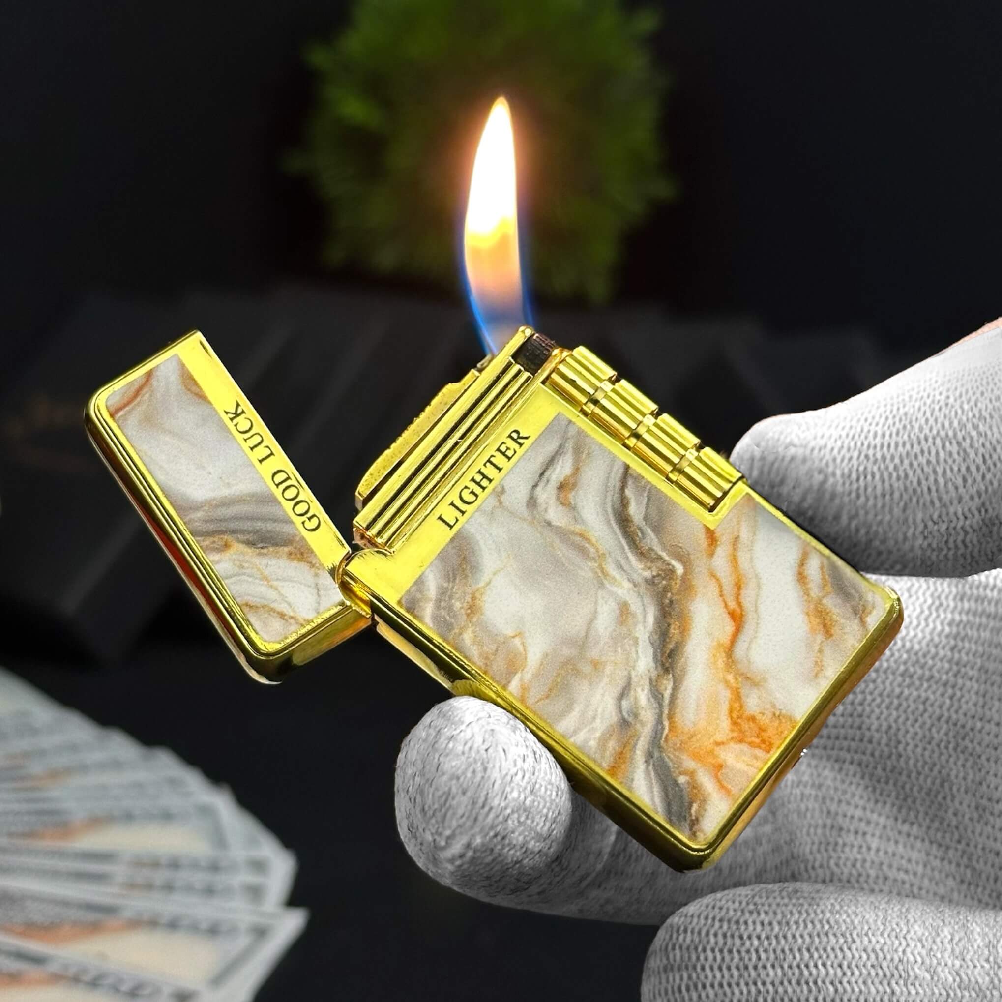 Elegant gold and marble-pattern lighter with a signature ping sound and smooth side flip ignition.